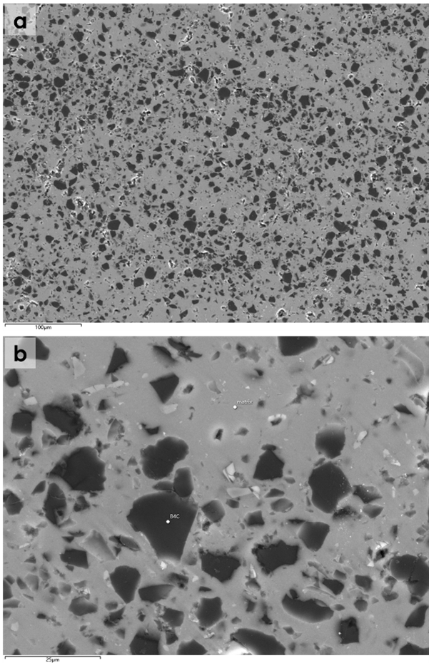 以金属基复合材料Al/B4C为例,图3为该复合材料的SEM电子图像,基体为铝合金,在电子图像中的衬度较亮。B4C相较暗,弥散分布在铝合金基体中。