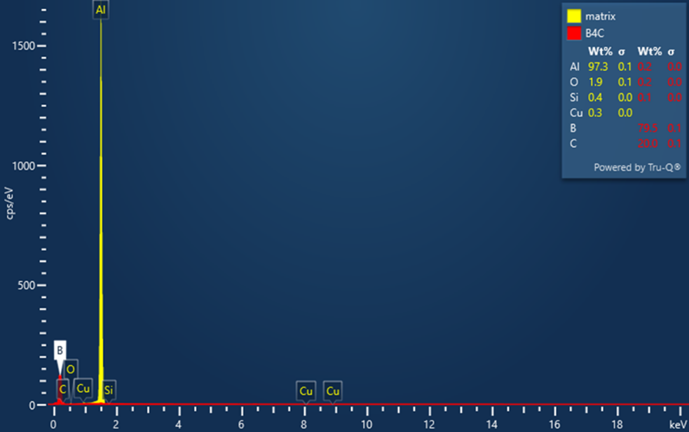 使用能谱仪(EDS)对该复合材料中的 Al 基体和B4C相分别进行定量分析,结果如图4所示。铝合金中含有微量的Cu、Si元素。B4C 颗粒中C和B元素均为轻元素,对能谱仪(EDS)定量技术的准确性要求很高,定量结果中B和C的原子比接近理论值 4 : 1。实际上,国际和国内标准都未对元素周期表中 Na 之前元素的定量准确性做出具体要求。从两相的定量结果看,牛津仪器能谱仪(EDS)的无标定量分析具有很高的准确性。