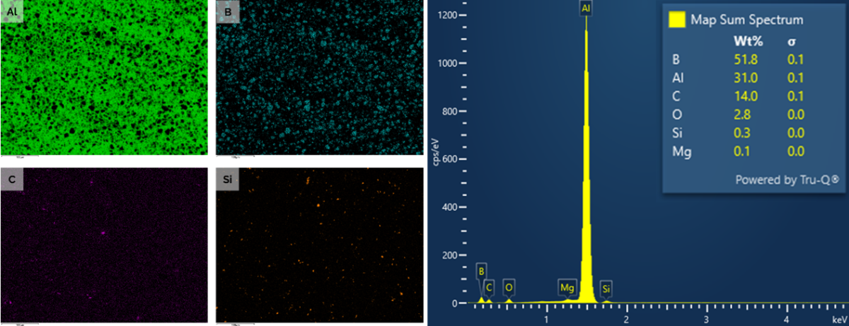 某区域(面积为560μm×420μm)的元素分布如图5所示。其中Al、B元素分别对应Al基体和B4C相。众所周知,显微分析容易受到积碳污染的干扰,基体和B4C相中C元素的X射线信号强度对比不明显。Si元素在局部呈点状分布,可能源于富硅的杂质。基于该区域元素分布的定量结果显示,Al元素的含量约为31wt.%,显著低于成分设计的预期(~70wt.%)。从图5中两相的面积分布也可推测出Al元素的占比不少于50wt.%。