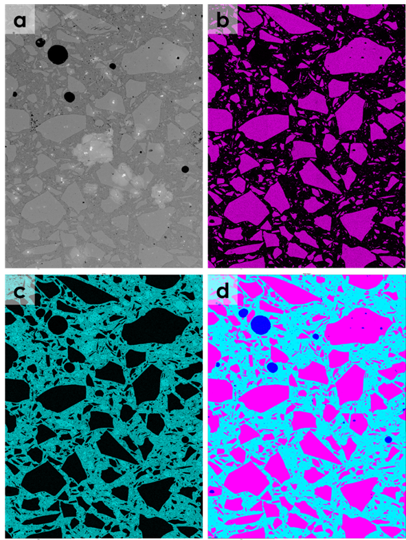 某耐火材料中有两个主相:Al2O3和SiO2,其中Al2O3相的颗粒大,单视场的相分析不具有统计意义。图7 为大面积拼接(LAM,Large Area Mapping)的元素分布及AutoPhaseMap分析的相分布。大面积拼接(LAM,Large Area Mapping)功能可将设定区域分割成若干个小区域,逐个区域分析之后合并成一个大区域。该功能可以配置在面分析中,是大范围分析的利器。图7中拼接区域面积约为2 cm × 3 cm,具有足够的代表性。图7(a)中两种相的衬度差异与Al、Si元素(图7b~c)的分布相对应。图7(d)的AutoPhaseMap 分析显示,Al2O3和SiO2相的面积比例分别为55.5%、43.1%,孔洞的面积占比约为1.3% 。