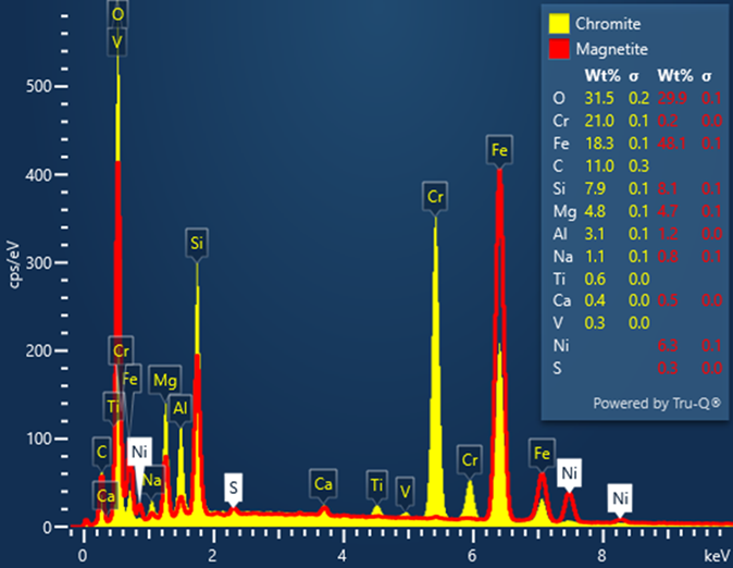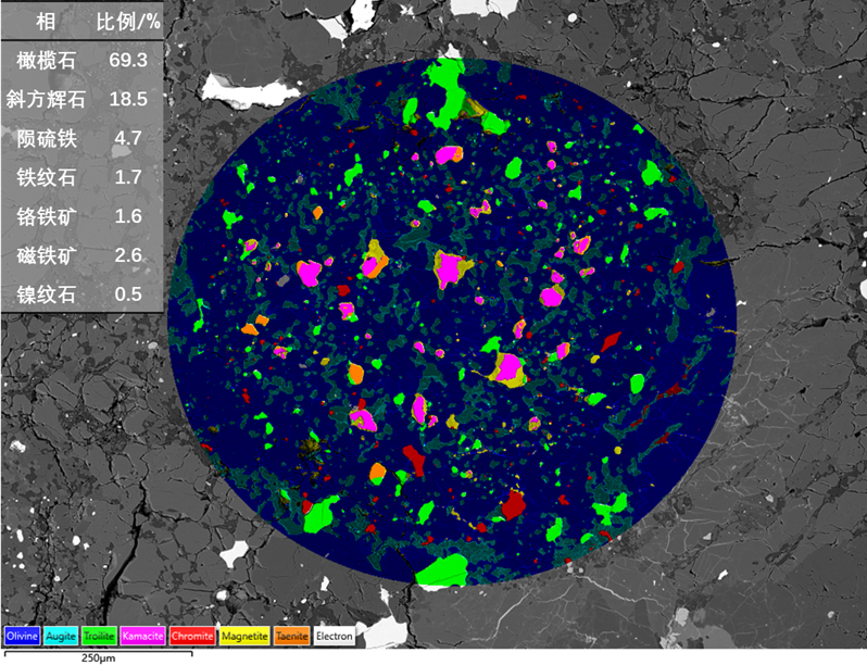 对于相组成复杂的地矿类样品,AutoPhaseMap的相分析也有很好的表现。图8是AutoPhaseMap分析得到的普通球粒陨石中球粒的相分布,左上角给出了各相的面积比。其中橄榄石的比例最高接近70%,其次为辉石,约占19%。陨硫铁占比4.7%。铁纹石、镍纹石的比例分别是1.7%、0.6%。其余的相为铁的氧化物:铬铁矿、磁铁矿。铁纹石和镍纹石的差异在于Ni含量的高低,磁铁矿和铬铁矿的差别在于Cr元素,相区分难度很大。AutoPhaseMap的灵敏性非常高,可以轻易地区分这两组成分接近的矿物。如图7所示,磁铁矿和铬铁矿的谱图和定量结果清晰地显示Cr、V、Ti元素含量在两相在中的差异。
