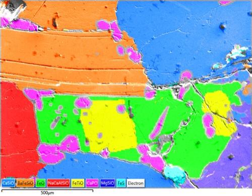 图2用不同的颜色表示AutoPhaseMap处理后得到的相分布。这个样品中含有成分差异明显的相——氧化物、硅酸盐、磷酸盐和硫化物。