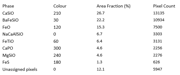 更推荐的方法是找到样品中相同成分的所有区域(同一相),并确定它们的元素组成及其丰度。牛津仪器提供了AutoPhaseMap自动相分布功能来解决这种多相材料分析时遇到的基体校正问题。AutoPhaseMap将图1中元素种类和含量相近的像素点合并生成相应的相,然后计算每个相的成分和面积占比,相的分布和面积比例如图2及表1中所示。