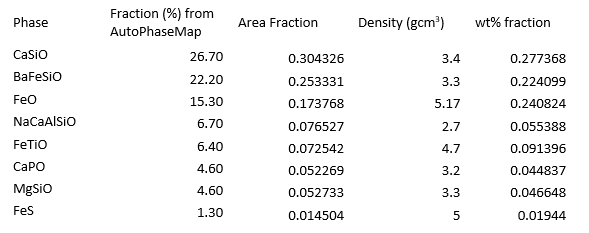 然后确定每个相的含量,如表3所示。这是由相的面积比例(从AutoPhaseMap计算得到)和相密度(取自www.webmineral.com)确定的。