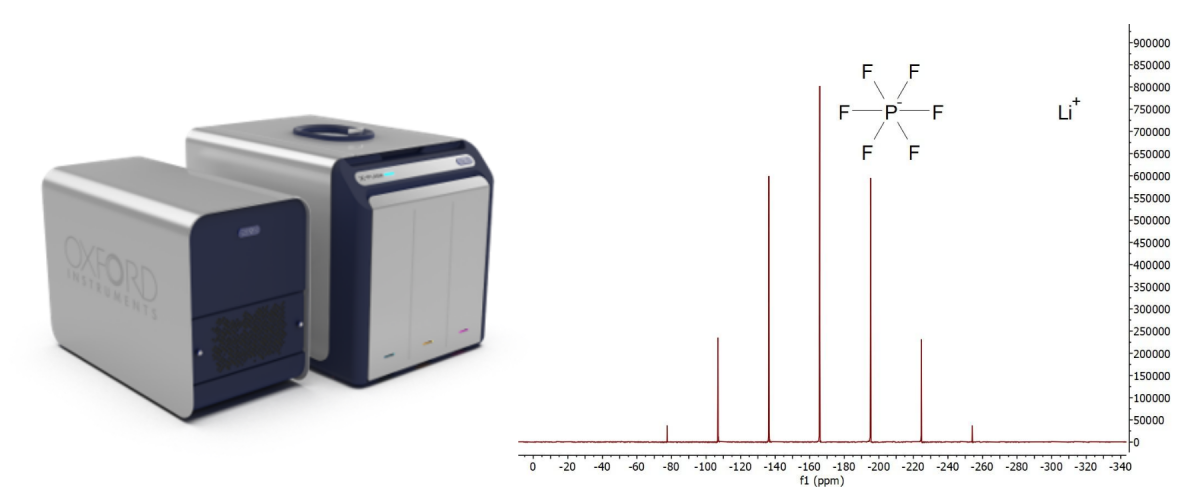 图1(右): X-Pulse核磁共振系统能够在现场条件下进行全电解液表征或质量控制。电解质LiPF6反应产物PF6的核磁谱图。