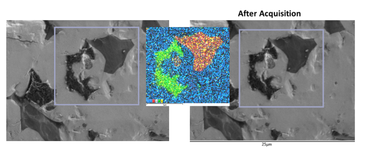 图2:(左)采集前的固态石榴石电解质;(中)利用 Ultim Extreme在2.5k, 100pA条件下采集的元素面分布图——确定了三种不同的含锂相;(右)采集后相同的区域,几乎无损伤