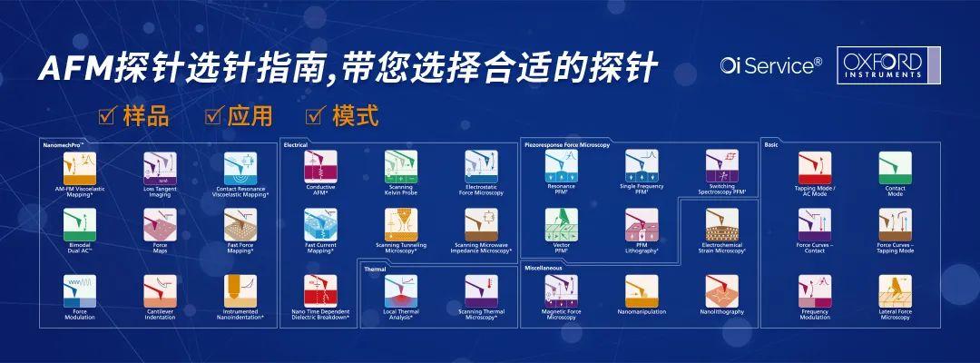 为了解决各位用户在各种复杂场景下选择合适的探针产品的难题,牛津仪器在线商城联合牛津仪器 Asylum Research 部门的应用科学家们推出了:AFM探针选择指南,可以让AFM实验者以最简便快速的方式根据样品的种类,应用及模式来选择最合适的探针。点击如何选择合适的AFM探针 (oxinst.cn),访问牛津仪器在线商城(www.51haocai.cn)AFM探针选型指南专题页面,现在开始为您选择最合适的探针。