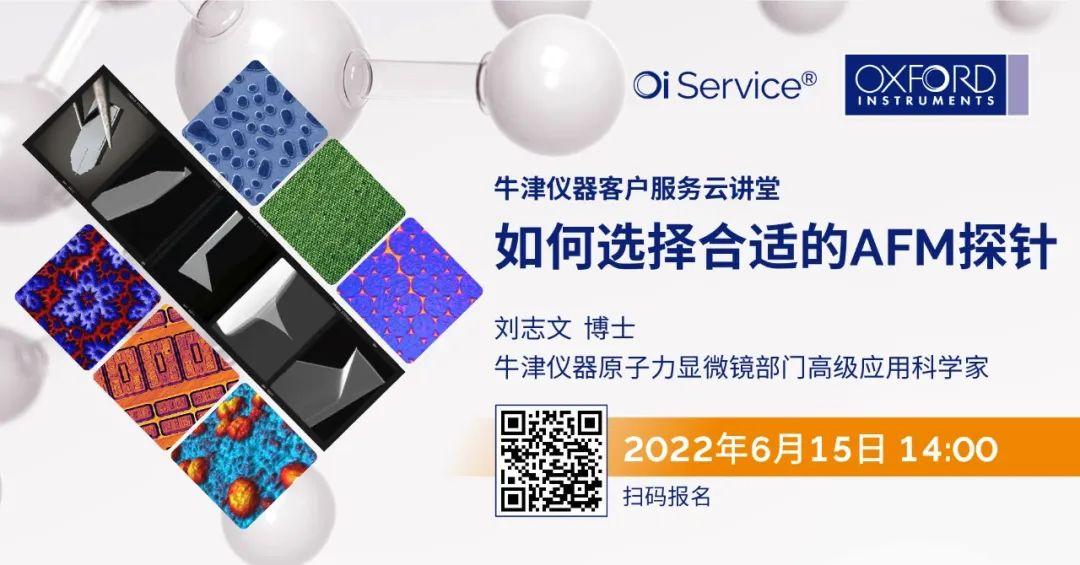除了线上推出的AFM探针选择指南为您助力,我们在6月15日请到了牛津仪器Asylum Research 部门的高级应用科学家刘志文博士,为大家带来主题为:如何选择合适的AFM探针的报告,欢迎大家关注。直播中,我们也为大家准备了罗技蓝牙键盘、颈椎按摩仪等诸多好礼,欢迎您扫描下方二维码,或点击如何选择合适的AFM探针 (oxinst.cn)预先注册