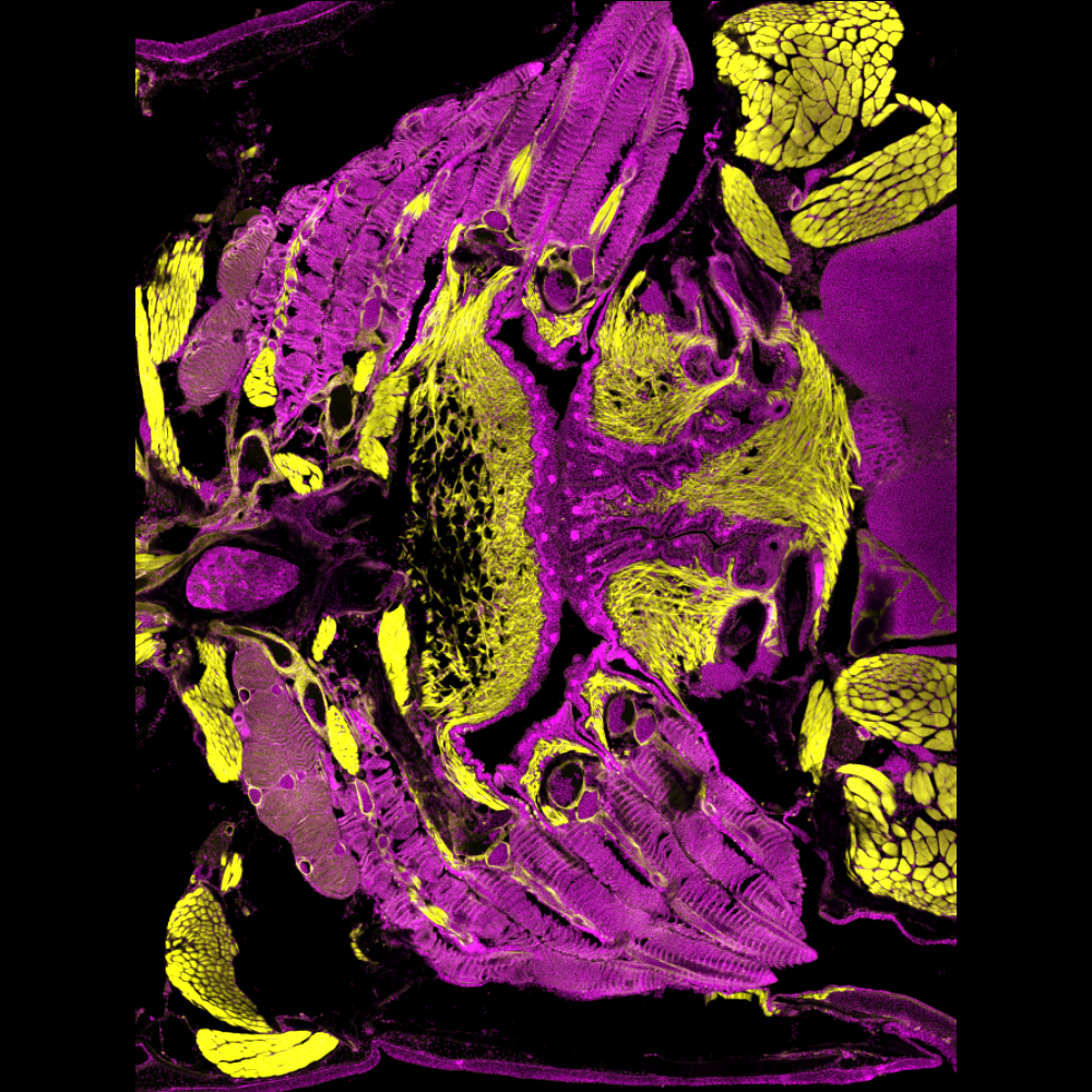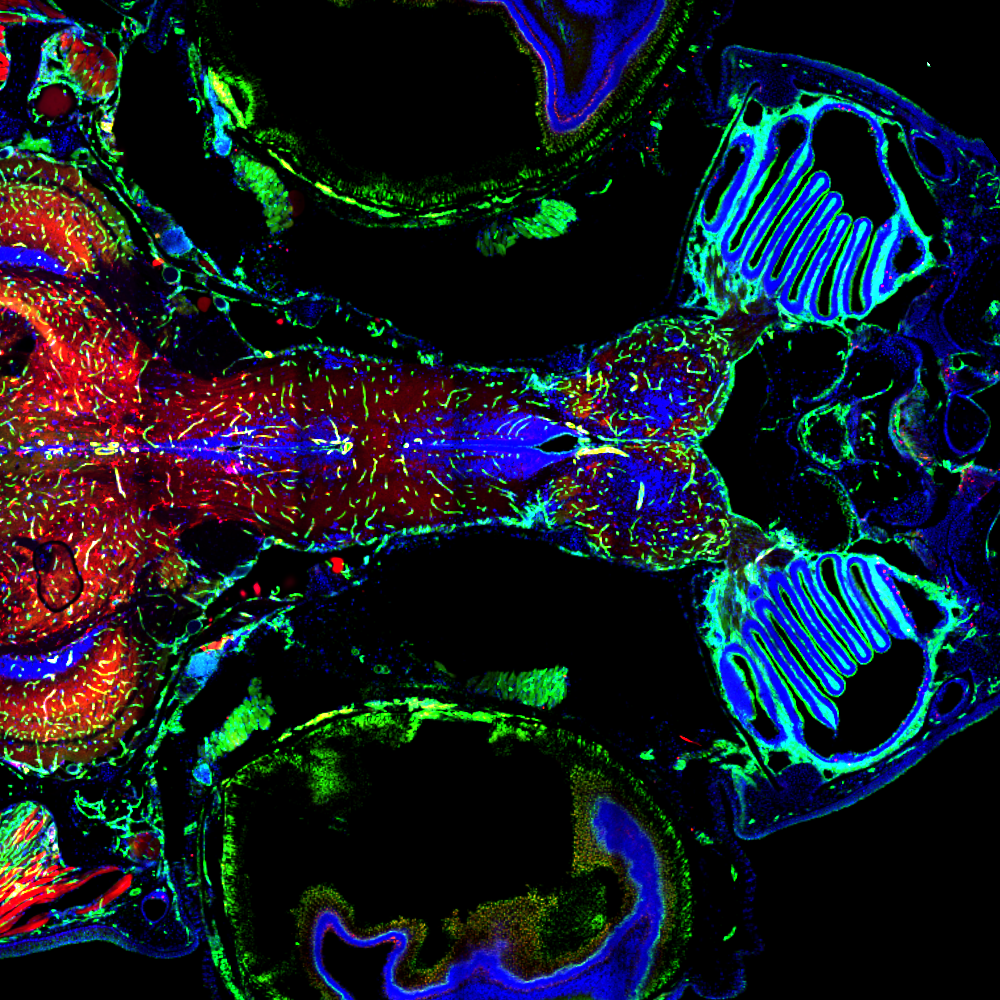 Description: Zebrafish with red neural tube staining and MITFA-GFP cytoplasmic stain for melanocytes. 331 slices captured over 110um depth at 25x magnification with 25um pinhole. Zyla 4.2 There are very bright and very dim structures in the red channel. The 16-bit dynamic range of the camera mean all signals are detected and in range to that all detail is visible. A point scanning confocal finds this challenging to handle.