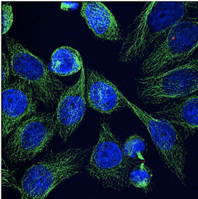 Description: HeLa cells stained for MKLP1 (red), a-tubulin (microtubules in green), and DAPI (in blue). Image was acquired in a Dragonfly 505 with an iXON 888 camera using the SRRF-Stream+ mode.