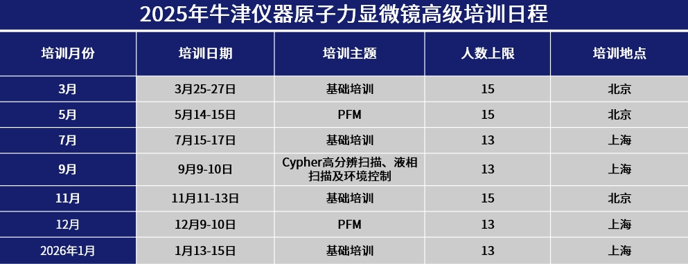 点击报名牛津仪器2025年3月份原子力显微镜高级应用培训(北京) 点击报名牛津仪器2025年5月份原子力显微镜高级应用培训(北京) 点击报名牛津仪器2025年7月份原子力显微镜高级应用培训(上海) 点击报名牛津仪器2025年9月份原子力显微镜高级应用培训(上海) 点击报名牛津仪器2025年11月份原子力显微镜高级应用培训(北京) 点击报名牛津仪器2025年12月份原子力显微镜高级应用培训(上海) 点击报名牛津仪器2026年1月份原子力显微镜高级应用培训(上海)