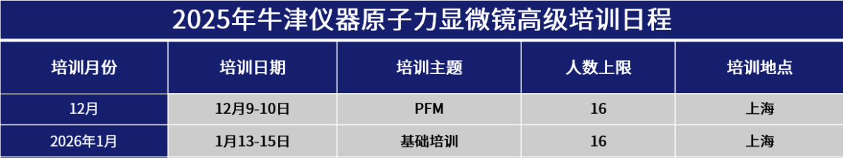 牛津仪器定期会开展原子力显微镜应用培训,此培训内容包括基本原理,基础操作,成像优化,数据处理,基础力学(力曲线, AMFM),基础电学(CAFM,SKPM)、AFM最新应用进展、液相,气氛控制,温控、高分辨原理,探针选择,参数优化等多个方向,您可以根据您感兴趣的内容选择想要参加的培训。