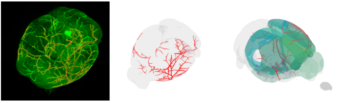 使用Imaris准确的信号识别 (Spot, Surface血管),将识别的信号载入到标准脑中,便于展示信号的相对空间位置以及比较不同组别的信号分布。