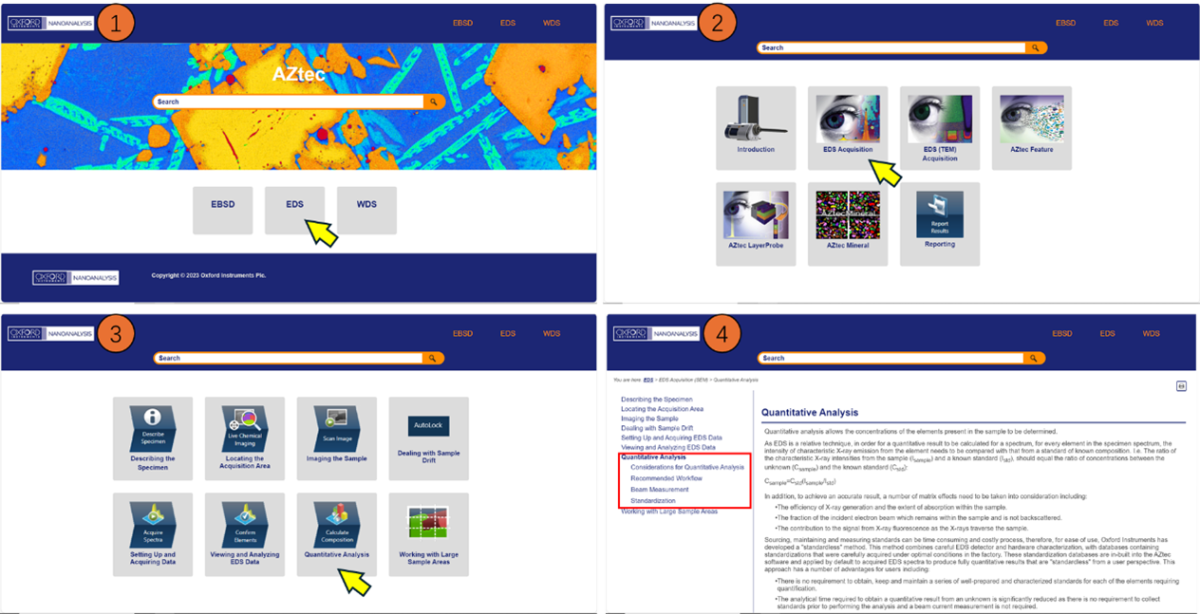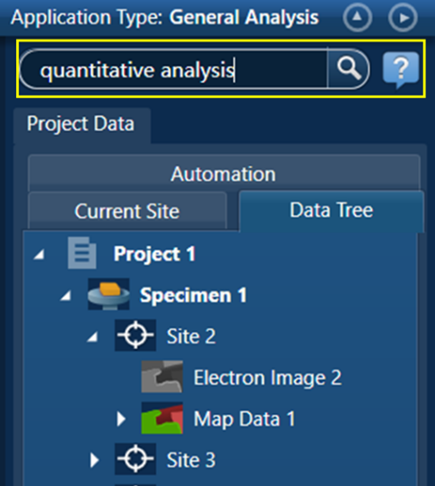 AZtec还内嵌了纳米分析内容的搜索框,位于数据树上方(图6),它可以帮助客户学习显微分析的相关内容。您可以在搜索栏中输入关键词,如定量分析,查找相关内容。也可以直接打开纳米分析的主页查询感兴趣的内容。如图7所示,选择“EDS-EDS采集-定量分析”,很快就可以找到有关定量分析的理论知识。